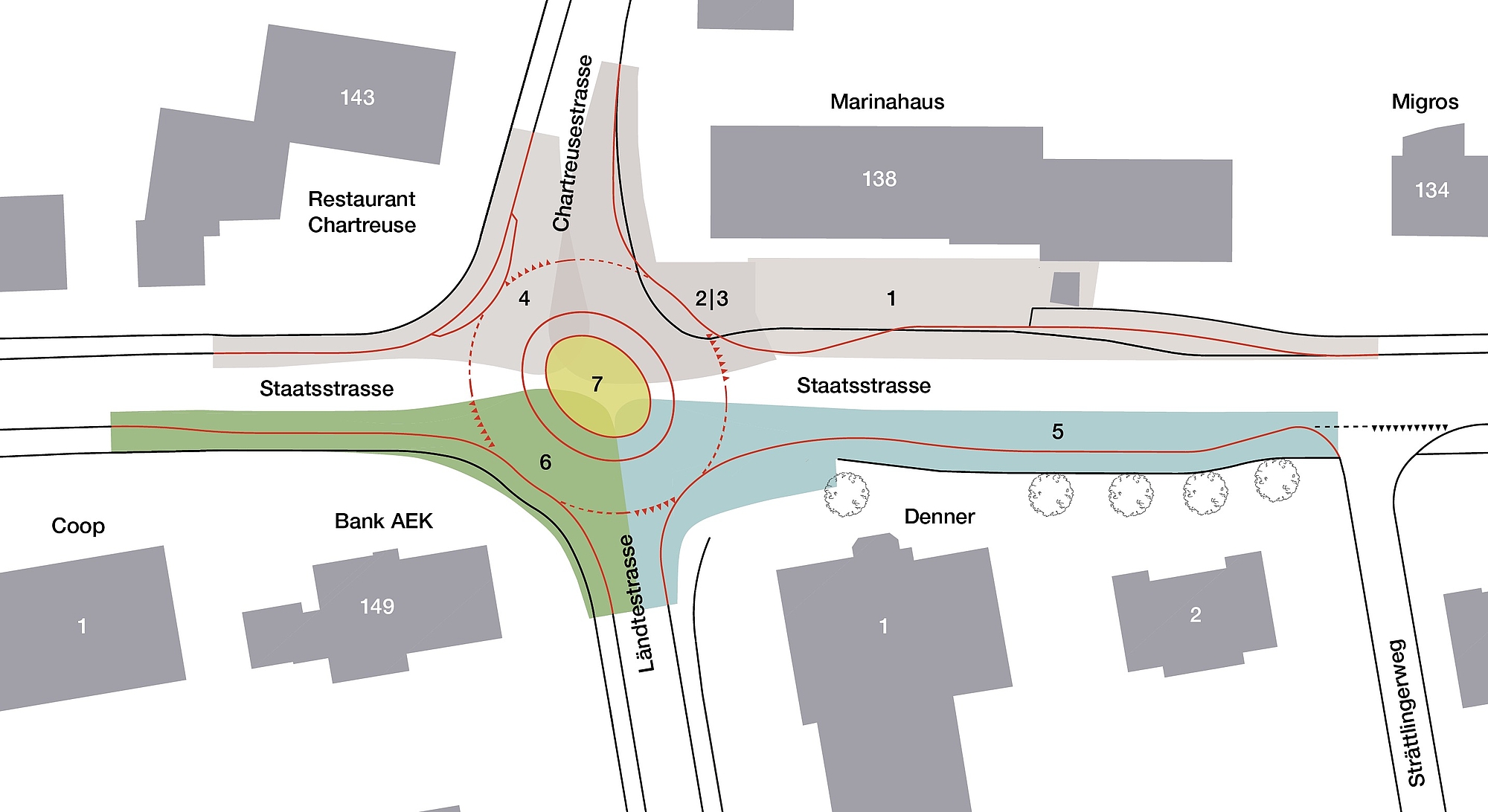In der Woche vom 3. November 2025 wird der Verkehr auf der Chartreuse-Kreuzung auf Kreisverkehr umgestellt. Bis dahin bleibt die Einmündung der Ländtestrasse in die Staatsstrasse halbseitig gesperrt.